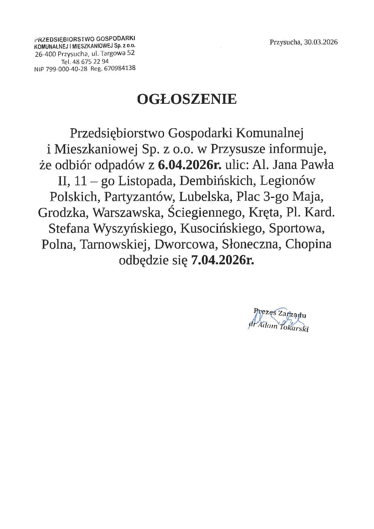 Ogłoszenie dotyczące odbioru śmieci