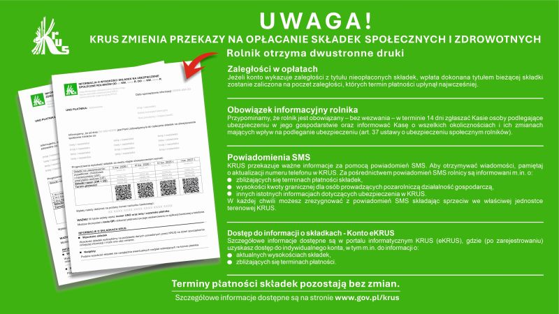 Ulotka informacyjna KRUS o zmianie przekazu na opłacanie składek 20-04-2026Data publikacji, 20-04-2026, Piotr ChojnackiAutor, Piotr Chojnacki, 55Ilość wyświetleń, 55