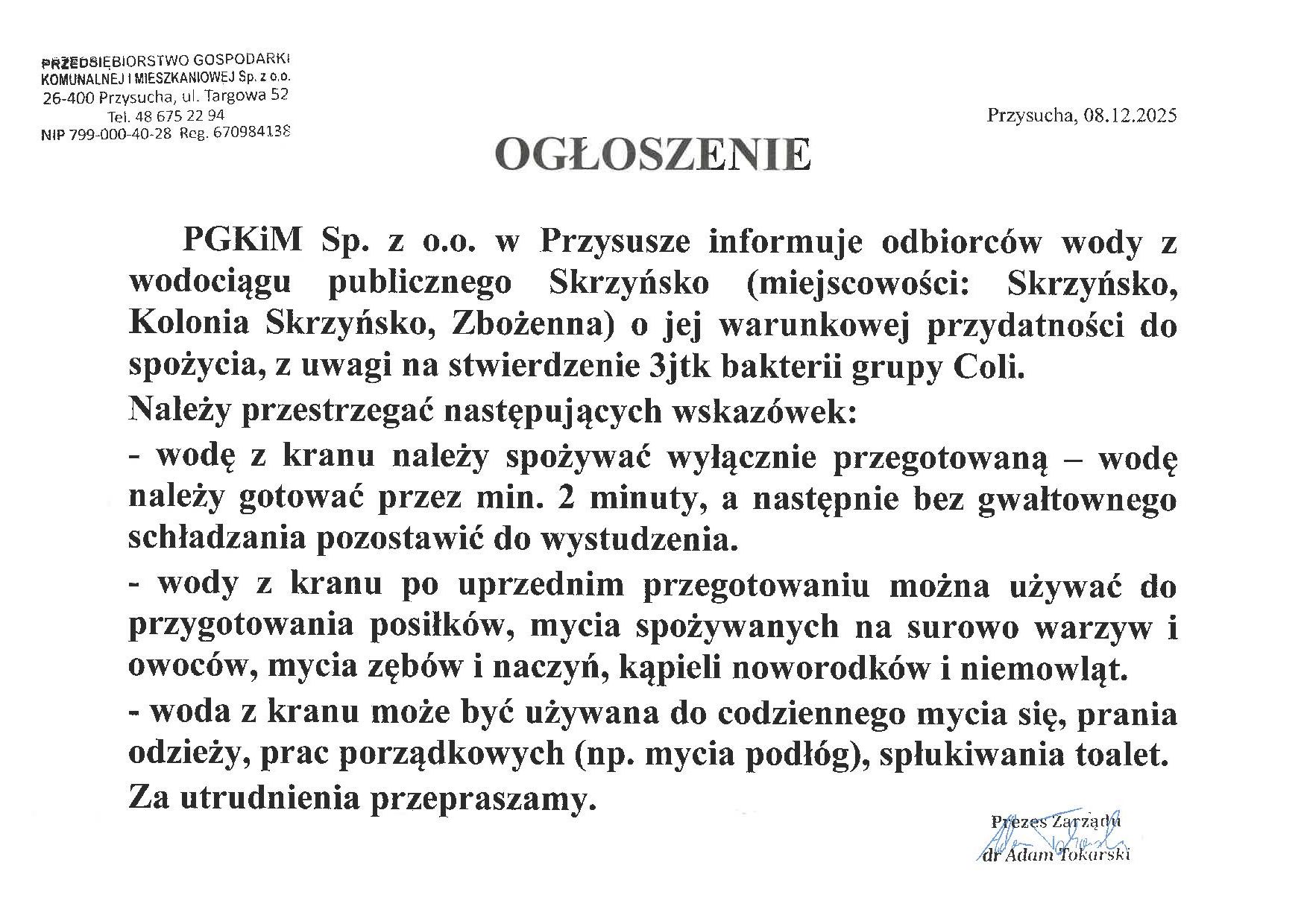 Ogłoszenie dla odbiorców wody z wodociągu publicznego Skrzyńsko 08-12-2025Data publikacji, 08-12-2025, Karolina SiaraAutor, Karolina Siara, 88Ilość wyświetleń, 88