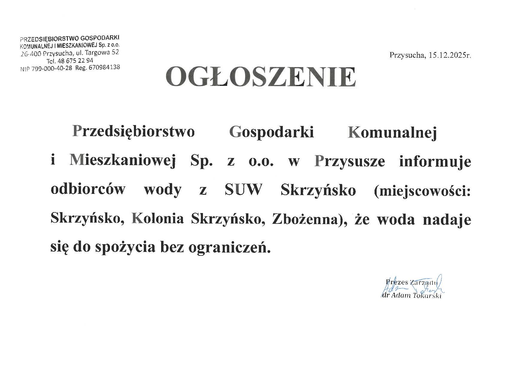Ogłoszenie dla odbiorców wody z wodociągu publicznego SUW SkrzyńskoArchiwum